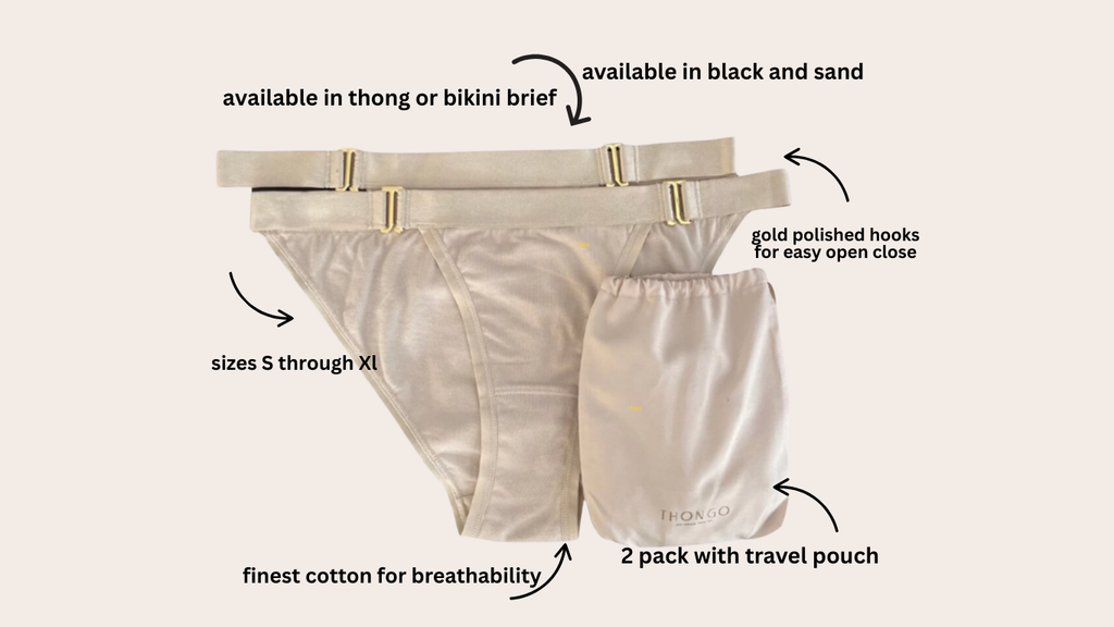 THONGO gives you the convenience to feel your most confident self while traveling or any other activity that leaves you feeling sweaty and not so fresh. Perfect for a quick change in the smallest of spaces. Sold as a two pack one for wearing and one to change into.